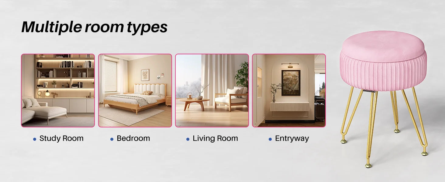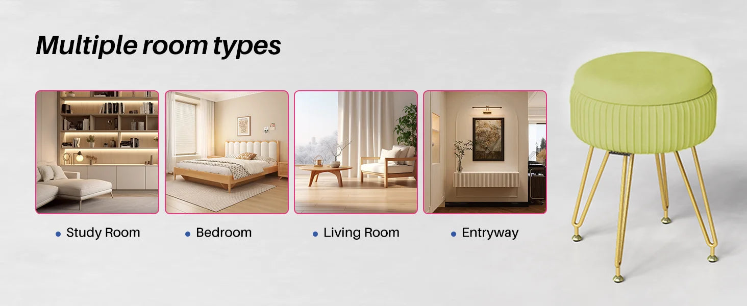 Enhance your living space with the Ljustra Velvet Vanity Stool and enjoy a blend of style, comfort, and functionality!