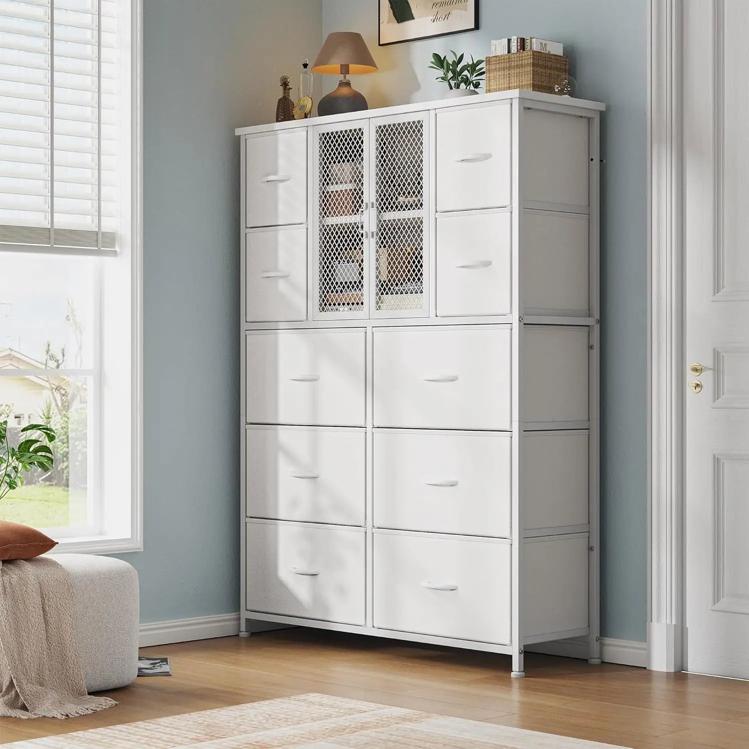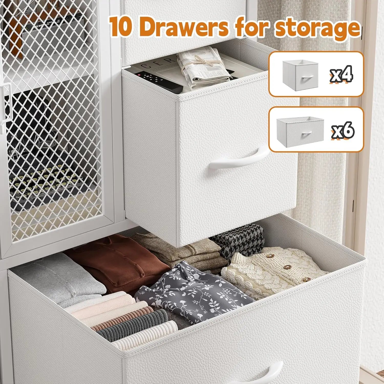 White Dresser Bedroom Organizer Tall Chest with 10 Fabric Drawers