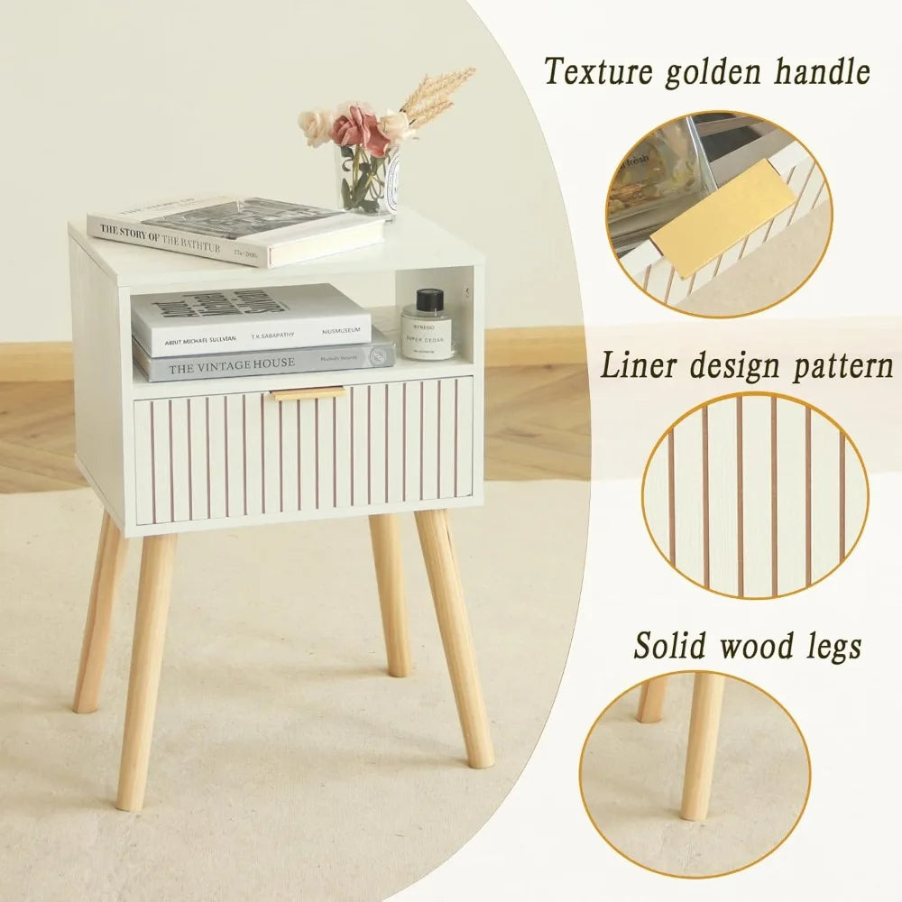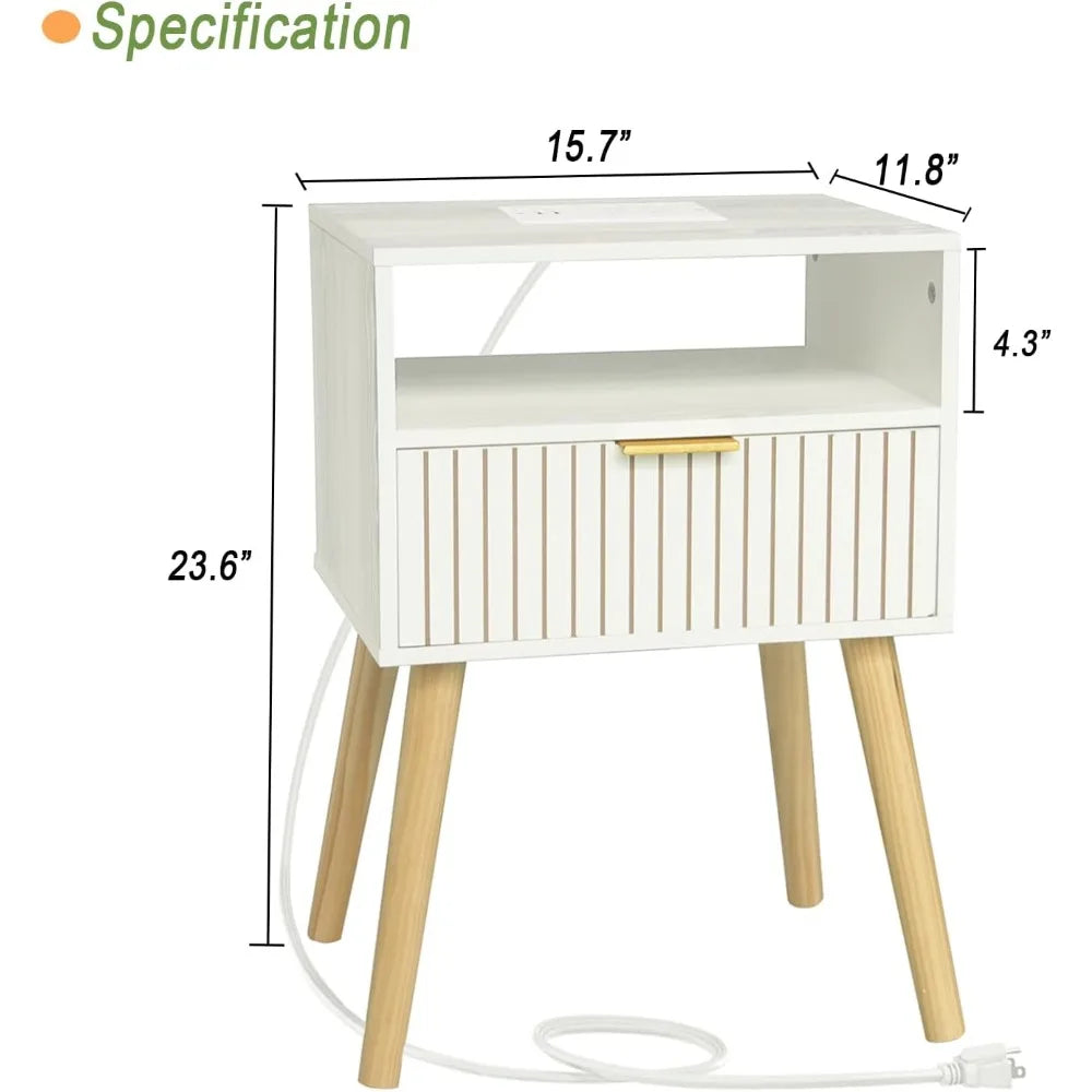 White Nightstand with Charging Station Mid Century Modern Bedside Table
