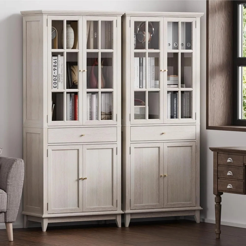 Modern White Oak Bookcase with Glass Doors Adjustable Shelves Storage