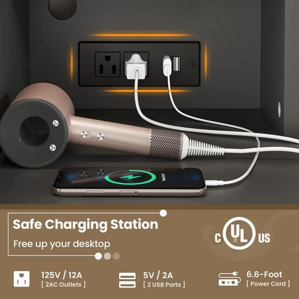 - Convenient Power Outlet: Built into the backboard, the vanity comes equipped with two AC outlets and two USB ports for charging devices and plugging in styling tools.