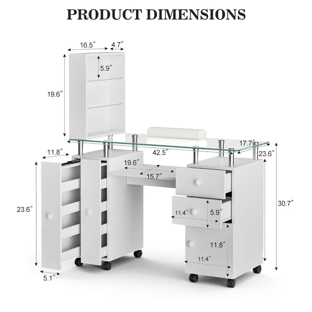- 💅 Large Storage Capacity: Keep your workspace organized with 2 side drawers, 3-tier shelves, a cabinet, and vertical storage drawers. All your nail polish and tools will be neatly displayed and easily accessible.