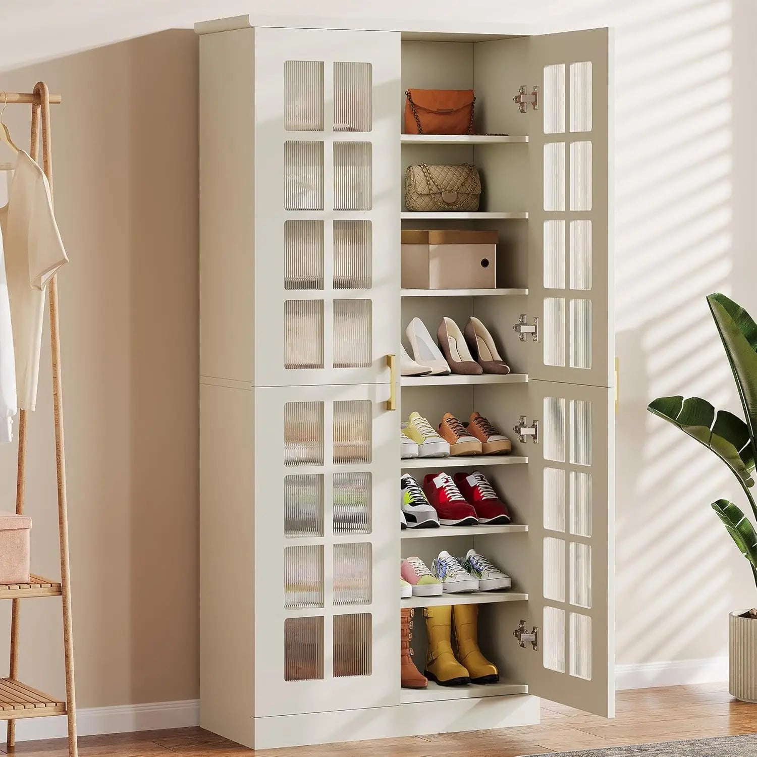 71 Inch Modern White Gold Shoe Cabinet 8 Tier Adjustable Storage Organizer