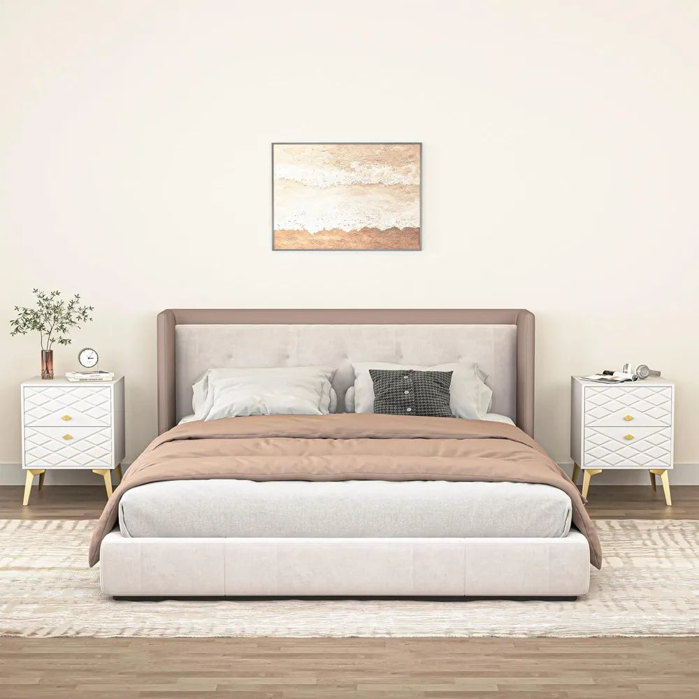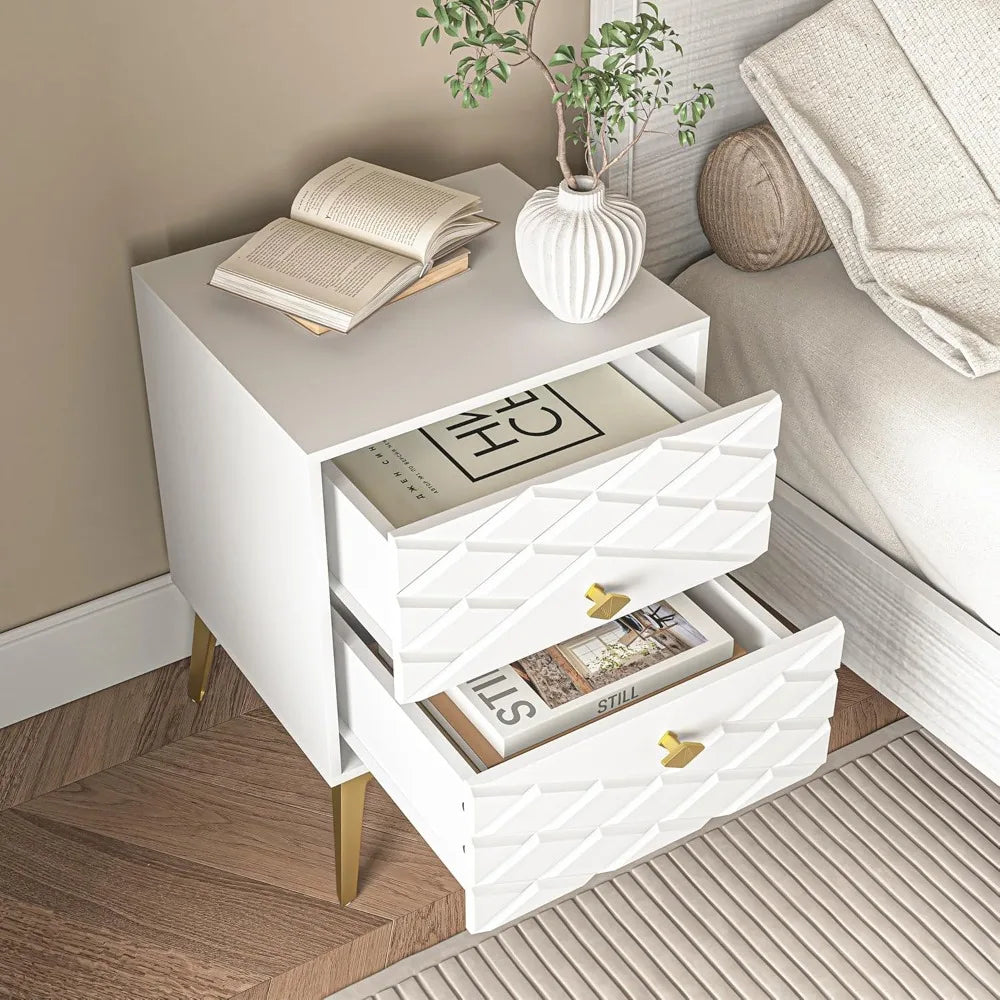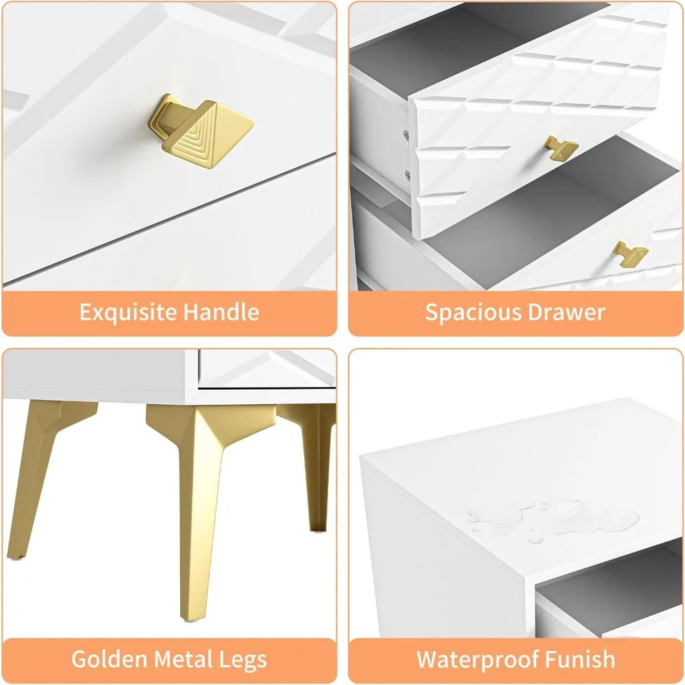 Modern White Nightstand Bedside Table with Gold Handles and Legs