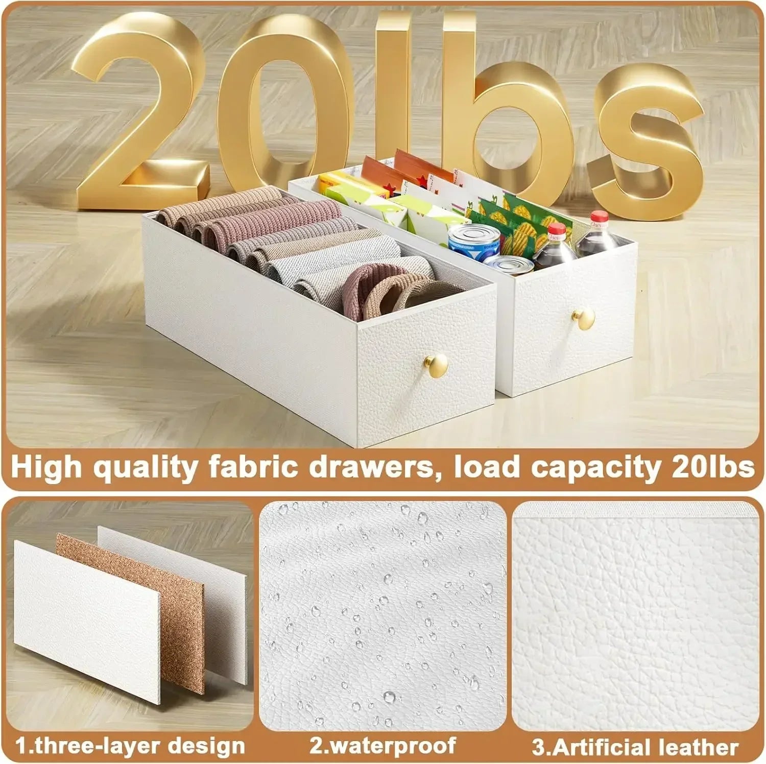 - Material: Wood Top, Steel Frame, Fabric Drawers with Leather Front