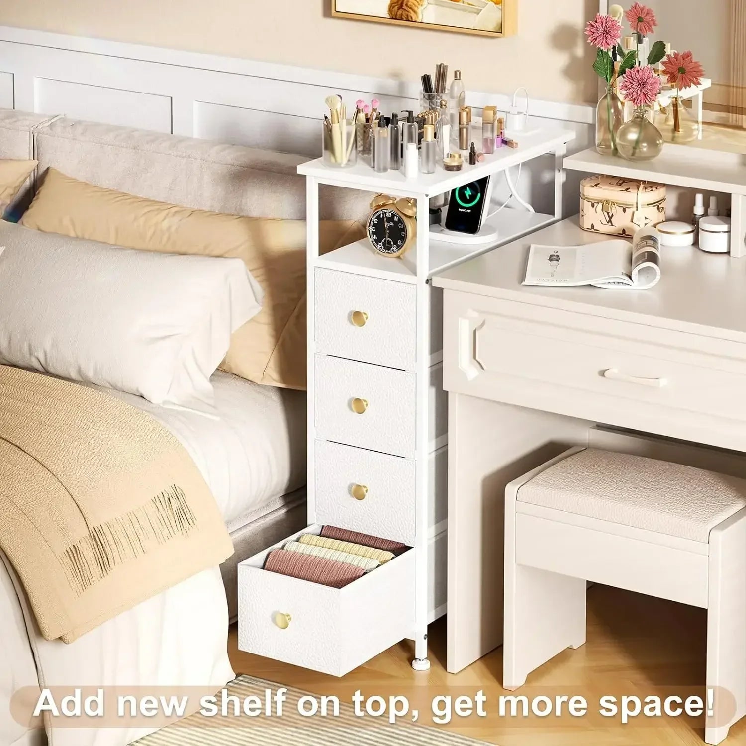 Narrow Dresser with Charging Station 4 Fabric Drawers Slim Chest