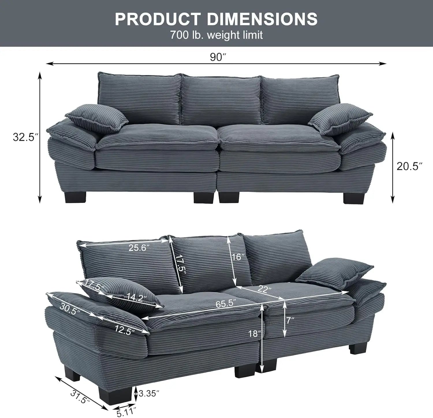 90" Oversized Corduroy Loveseat Sofa – Deep Seat Modern Couch with Pillows, Grey Upholstered Sofa