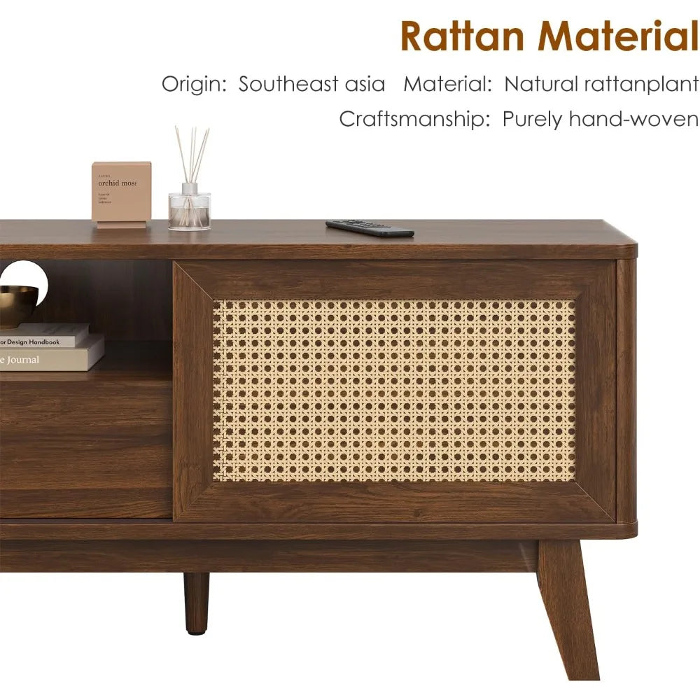 Rattan TV Stand Mid Century Modern Media Console with Drawer and Cabinets