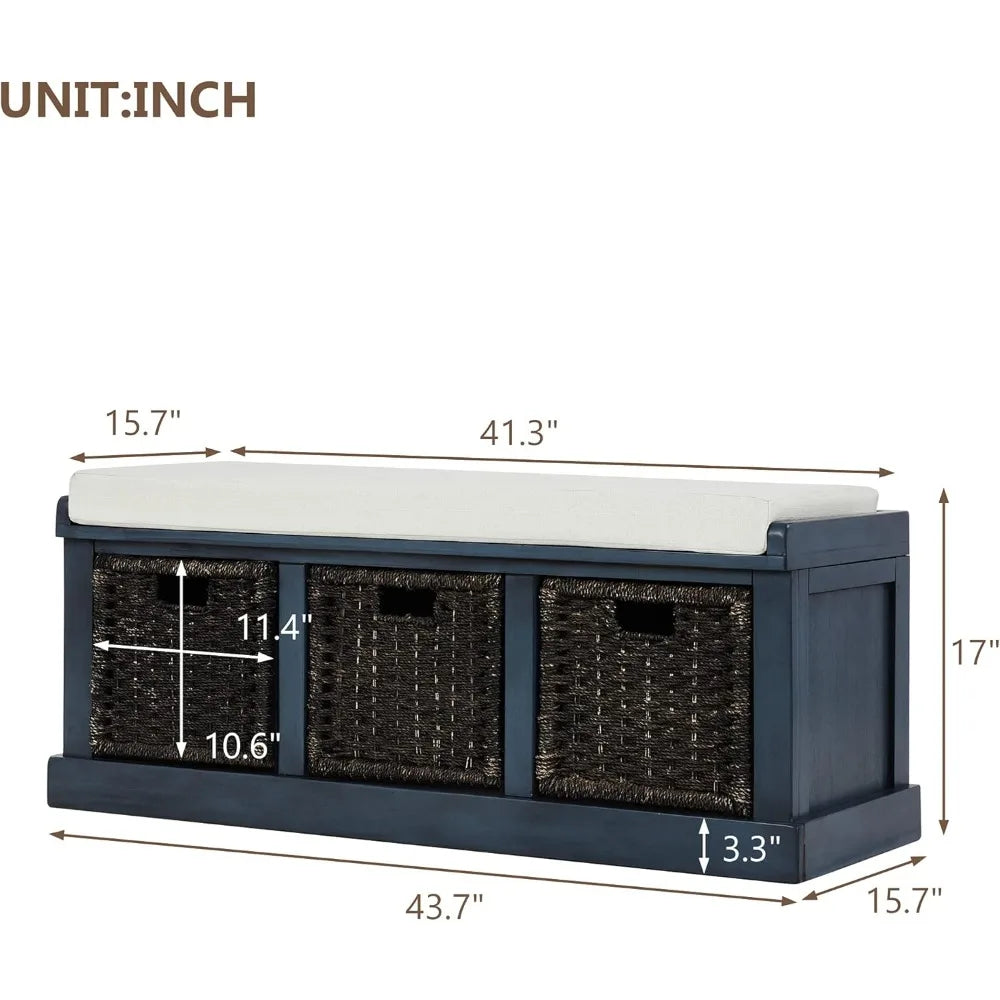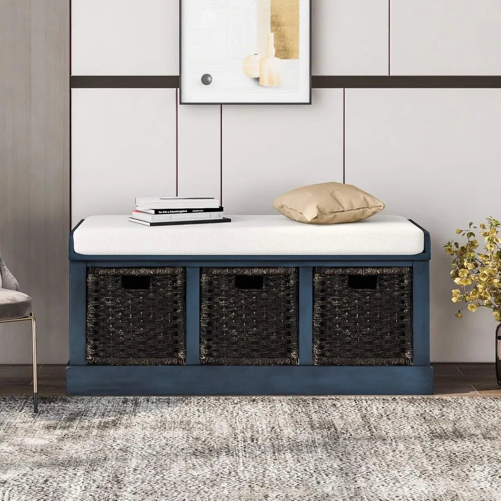 Rustic Storage Bench Entryway Bench with Rattan Baskets and Cushion