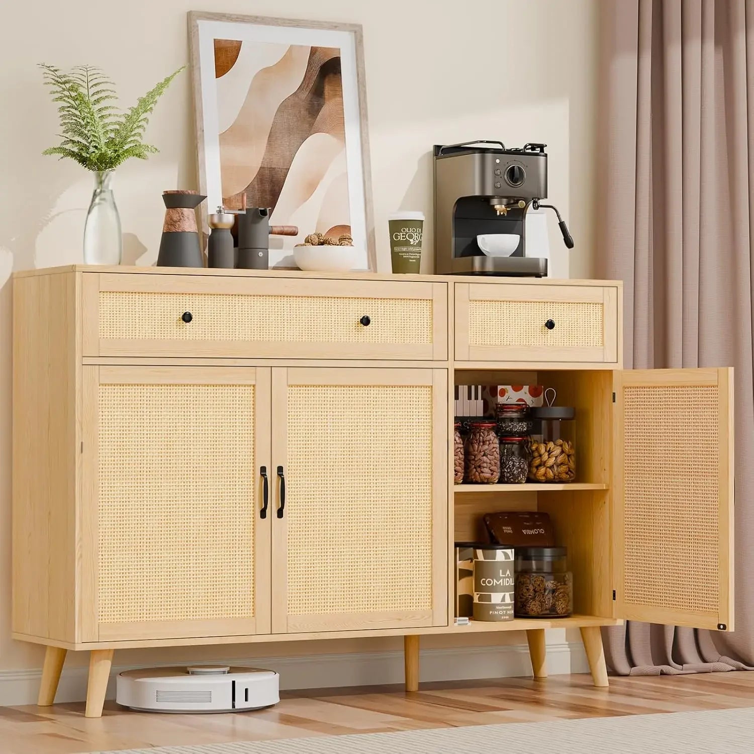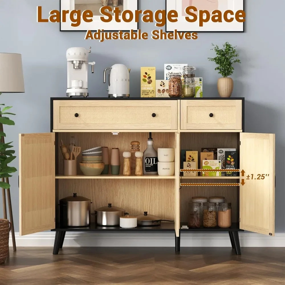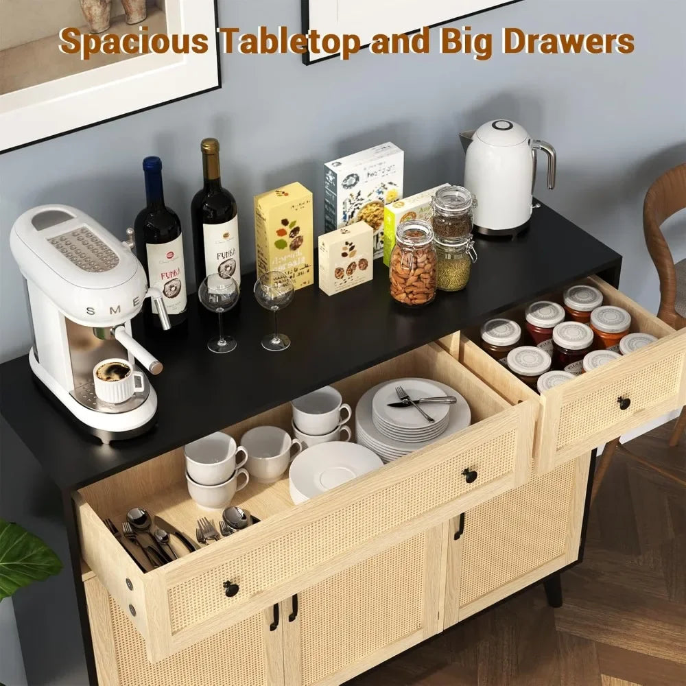 "Sideboard Buffet Storage Cabinet, Rattan Design with 2 Drawers & 3 Doors – Versatile Buffet Table for Kitchen, Dining & Living