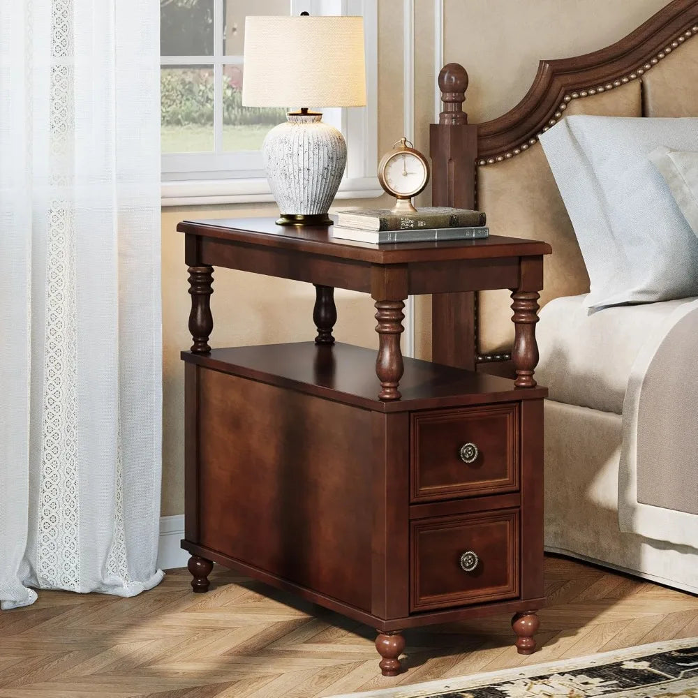 Solid Wood Nightstand 2 Drawers Mid-Century Modern Bedroom Table