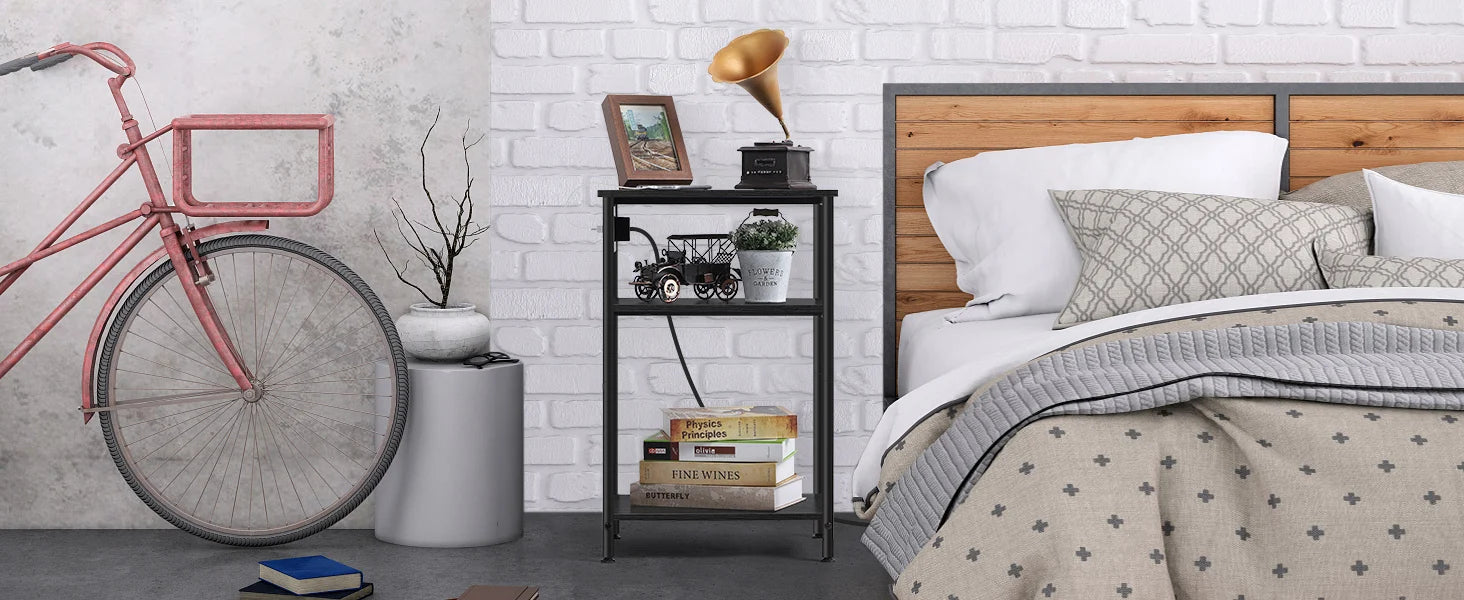 Elevate your bedroom with our Space-Saving Nightstand, designed for modern living without compromising style. This narrow bedside table is perfect for tight spaces, featuring a sleek industrial wood board and a sturdy black metal frame.