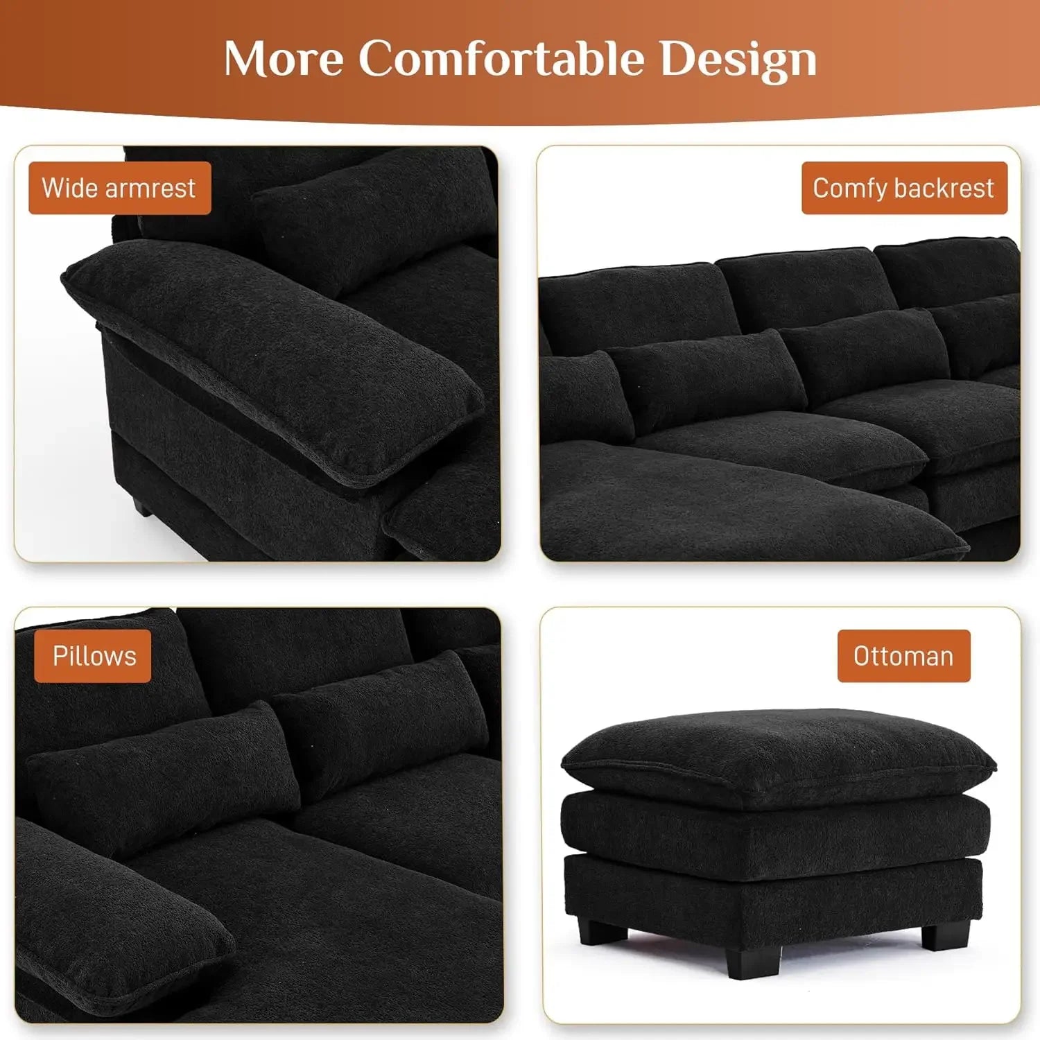 The Cloud Sofa sectional features 10.6" upholstered 2-layer seat cushions with high-resiliency foam and a 25.6" extra-deep seat to provide a soft and cozy feel. The extra-wide and extra-deep seating makes it perfect for entertaining or relaxing with loved ones. The independent ottoman can be combined with the sofa to form a U-shaped sofa with double chaise.