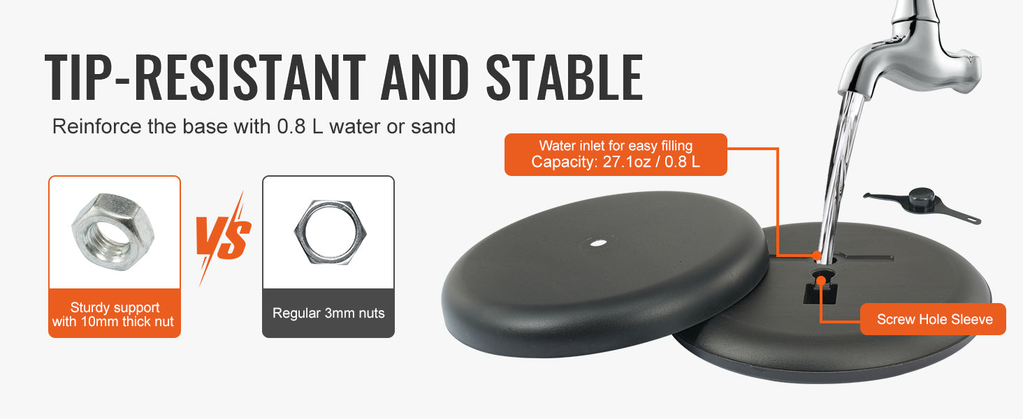 - Weighted Base: Fill the base with up to 0.8 L of water or sand for added stability against wind and accidental knocks.