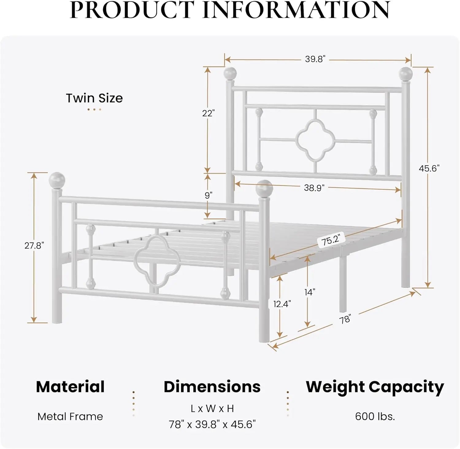 Vintage Twin Size Metal Platform Bed Frame with Headboard and Footboard