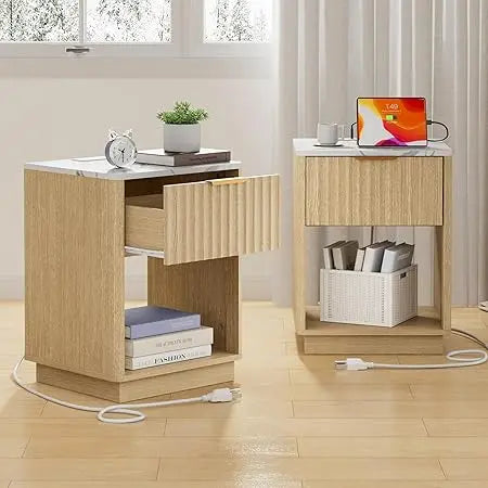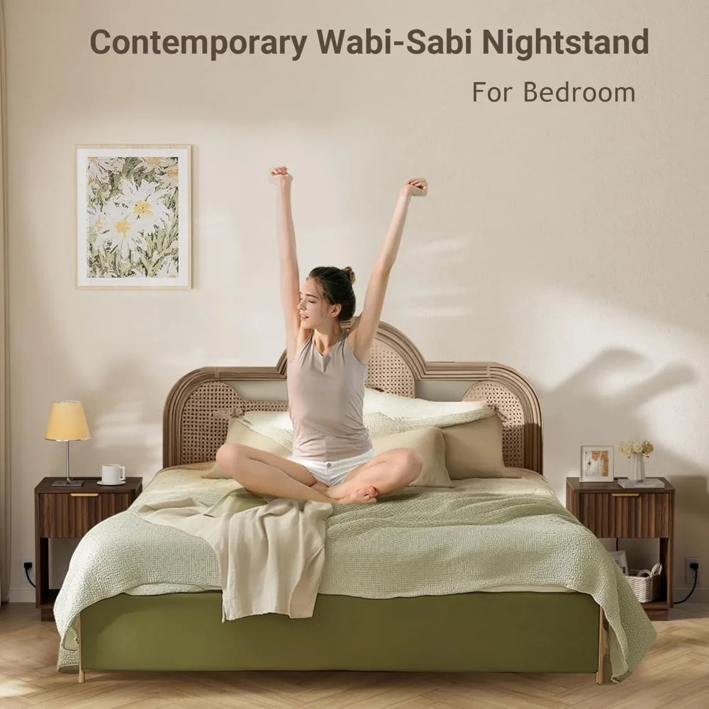 Walnut Fluted Nightstand Set of 2 Bedside Table with Charging Station