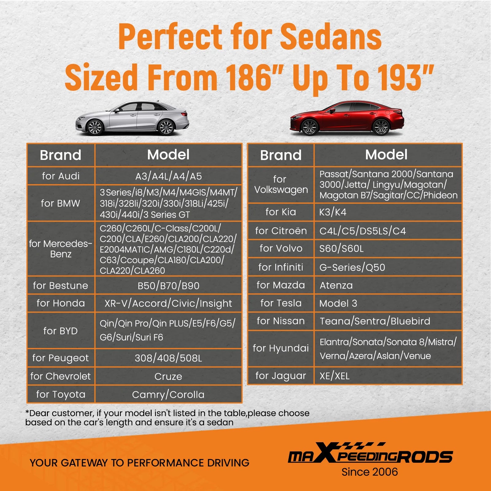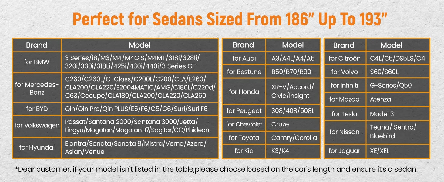 - Easy Fit: Fits sedan lengths from 15.5FT to 16FT (186-193 inches).